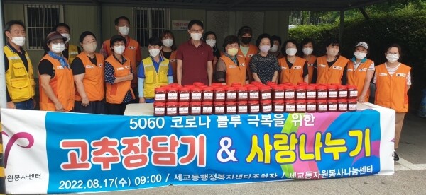 행사를 주관한 세교동 자원봉사 나눔센터 채석순 센터장은 “코로나19로 지친 5060세대와 취약계층 가구에 조금이나마 힘이 되길 바라는 마음에서 행사를 추진하게 됐다”고 밝히며 “더운 날씨에도 더불어 함께하는 사회를 만드는 자원봉사 나눔센터 회원들과 주민분들께 깊은 감사를 드리고 다시 급증하는 코로나19를 잘 극복하시길 바란다”고 전했다.