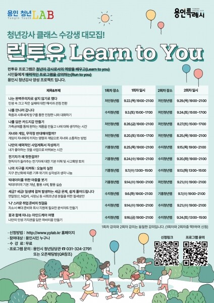 시 관계자는 "각 분야에서 활발하게 활동하고 있는 청년들이 강연을 기획한 만큼 수강생들에게 특별한 시간이 될 것"이라며 "청년 강사들이 정성껏 준비한 강연에 많은 관심과 참여를 부탁드린다"고 말했다.