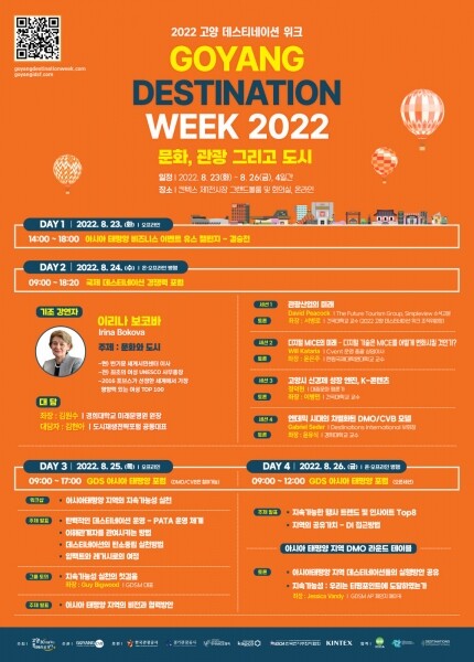 ‘2022 고양 데스티네이션 위크’는 1일차 ‘제1회 아시아 태평양 비즈니스 이벤트 유스 챌린지’, 2일차 ‘국제 데스티네이션 경쟁력 포럼’ 및 개막식, 3일차 ‘GDS 아시아 태평양 포럼’ 그리고 4일차에는 ‘GDS 아시아 태평양 포럼’ 및 관광 프로그램으로 구성될 예정이다.