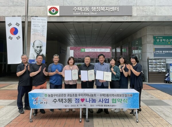 협약식에는 ‘농협구리공판장 과일조합 우리끼리나눔회’ 배진수 조합장 등 5명의 조합원들과 수택3동장, 수택3동 지역사회보장협의체 이영행 민간위원장 및 위원 등이 참석했다.
