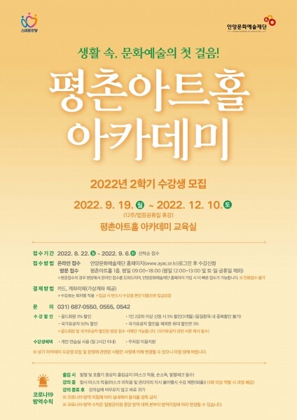 수강 신청은 8월 22일부터 9월 6일까지 안양문화예술재단 홈페이지 또는 평촌아트홀 현장에서 선착순으로 접수 가능하다.