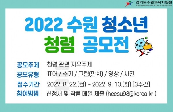 한편 수원교육지원청 감사담당관에서는 10월 중 접수된 작품들을 심사해 시상하고 우수한 컨텐츠는 추후 청렴 교육 및 홍보에 활용할 계획이라고 전했다.