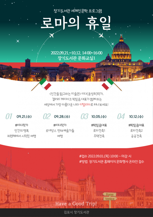 소영만 김포시립도서관장은 “도서관에서 떠나는 세계인문학 여행을 통해 시민들의 지친 일상을 위로하고 인문학적 소통을 강화할 수 있는 공간을 꾸준히 조성해 나가겠다”고 말했다.