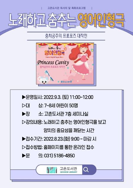이번 강의는 회차 당 7~8세 어린이 각 50명씩을 대상으로 진행되며 고촌도서관 특성화 주제인 영어를 활용한 창작인형극이다.