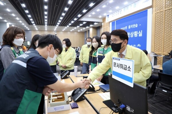 [뉴스써치] 수원특례시의회 김기정 의장과 이재식 부의장을 비롯한 의장단이 22일 수원시청 을지연습장을 방문해 2022 을지연습 훈련 상황을 참관하고 직원들의 노고를 격려했다.