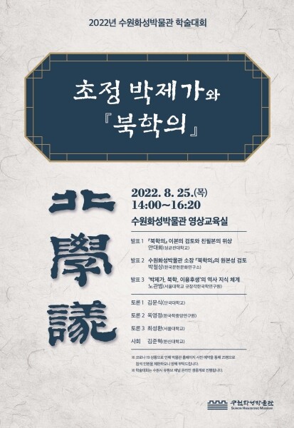 수원화성박물관 관계자는 “‘북학의’가 지닌 정조시대 실학의 상징성을 들여다보고 ‘북학의’의 문헌학적 특징, 수원화성박물관 소장본의 원본성에 대해 시민들에게 알리는 학술대회”며 “조선 후기 실학의 대표적인 인물인 초정 박제가의 저서 ‘북학의’에 다면적이고 심층적으로 접근할 것”이라고 말했다.
