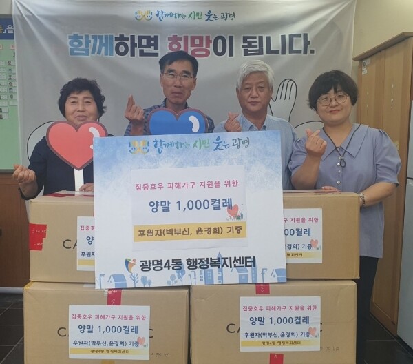광명4동 통장협의회는 침수피해 복구 현장에서 자원봉사활동을 하며 빗물 퍼내기와 집안의 내부 청소를 돕는 한편 십시일반 작은 정성을 모아 라면 150박스를 기부했다.