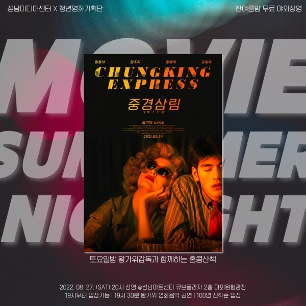 8월 27일 성남아트센터 내 큐브플라자 2층 야외공간에서 열리는 이번 무료 야외상영회는 ‘토요일밤 왕가위 감독과 함께하는 홍콩산책’이란 부제로 잠시 홍콩으로 여행을 떠난 듯한 분위기로 꾸며진다.