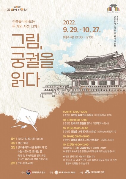 10월 20일에는 창덕궁을 탐방하는 ‘동궐을 걸으며 그리다’를 진행하고 10월 27일에는 후속 모임 ‘그림, 궁궐을 읽다’를 연다.