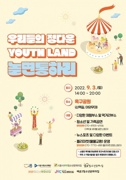 우리들의 정다운 YOUTH LAND ‘놀면통하리’에는 지역 내의 다양한 기관 및 청소년 참여·자치기구들과 함께 하는 40개의 다양한 부스체험 VR양궁, 테니스 파트너, 슬림퍽 등 새로운 경험 및 다양한 이벤트에 참여할 수 있는 뉴스포츠 다양한 세대가 즐길 수 있는 가족·세대·청소년팀의 무대를 관람할 수 있는 공연무대 등 총 3개의 프로그램이 마련돼 있다. 스탬프 투어로 남녀노소 모두가 즐겁게 참여할 수 있다.