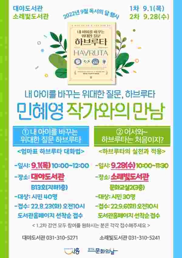 1회 차는 9월 1일 대야도서관에서 ‘내 아이를 바꾸는 위대한 질문, 하브루타’를 주제로 엄마표 하브루타 대화법에 대해 진행하며 2회 차는 9월 28일 소래빛도서관에서 ‘어서와~하브루타는 처음이지?’라는 주제로 하브루타를 실천하고 적용해보는 시간이 마련된다.