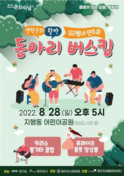 이번 동아리 버스킹은 동두천생활문화센터 동아리 네트워크 중 ‘카리스 통기타 클럽’과 ‘프레이즈 플롯 앙상블’의 연합 공연으로 ‘2022 경기도 문화의 날 프로그램 : 문화가 있는 오늘, 동두천’의 일환으로 개최된다.