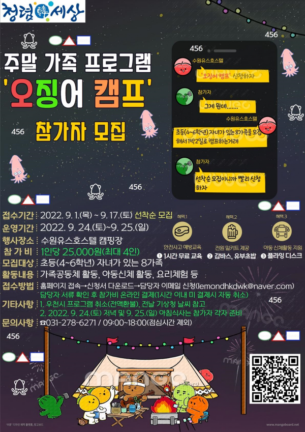 ‘오징어 캠프’는 수원유스호스텔의 특성화 시설인 캠핑장을 활용한 프로그램으로 도심 속 자연에서 즐기는 가족 캠핑문화를 조성하고 건전한 여가문화 활동을 지원하고자 기획한 프로그램이다.