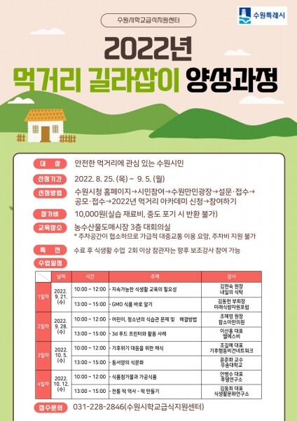 수원시 홈페이지 ‘시민참여→수원만민광장→공모’에서 ‘2022년 먹거리 길라잡이 양성과정 모집’을 선택해 신청하면 된다.