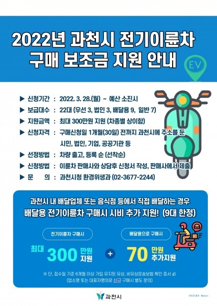 보조금은 접수일 기준 1개월 전까지 과천시에 주소를 둔 개인, 사업장이 위치한 법인, 기업 사업자 등이면 신청할 수 있으며 전기이륜차 출고 순으로 지원금이 지급된다.