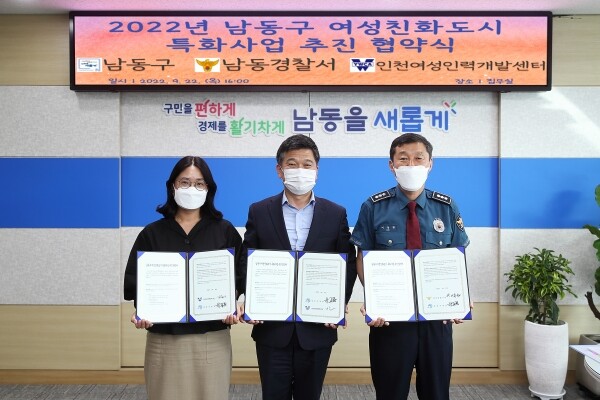 이번 협약에는 박종효 남동구청장과 이동원 남동경찰서 경무과장, 김승아 인천여성인력개발센터 관장이 참석해 남동구 여성친화도시 특화사업 추진을 위해 향후 기관 간 긴밀한 소통과 협력을 약속했다.