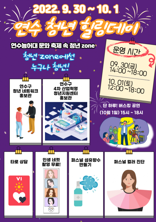 구 관계자는 “연수 청년 힐링데이를 통해 일상에 지친 청년들이 조금이나마 에너지를 받고 지역사회와 교감할 수 있는 시간이 되기를 바라며 청년 힐링데이 행사에 연수 청년들의 많은 관심과 참여를 부탁한다”고 말했다.