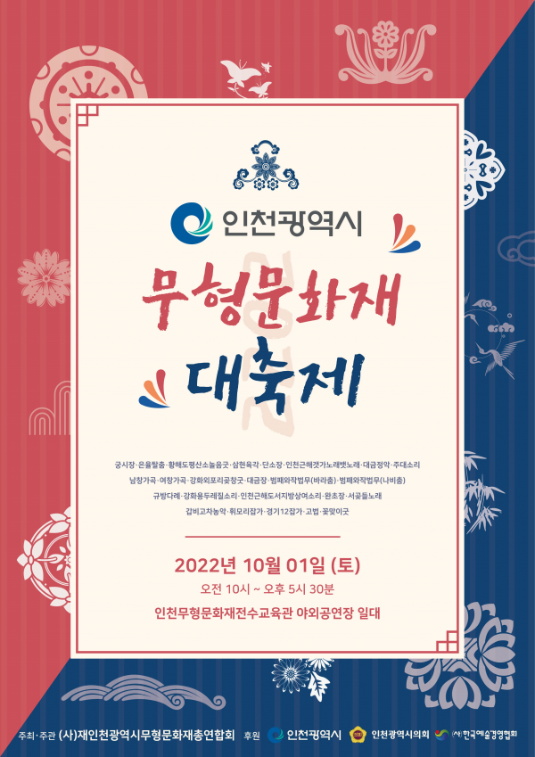 인천광역시는 오는 10월 1일 10시 인천무형문화재 전수교육관 야외공연장에서 ‘2022년 인천광역시 무형문화재 대축제’를 개최한다고 밝혔다.