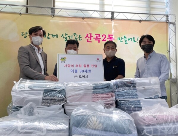 천승화 주식회사 모이세 대표는 “고물가로 경제적 어려움을 겪고 있는 이웃 분들에게 조금이나마 도움이 되고자 이불 세트를 준비했다”며 “앞으로도 지역사회에서 지속적으로 나눔 활동을 펼치겠다”고 말했다.