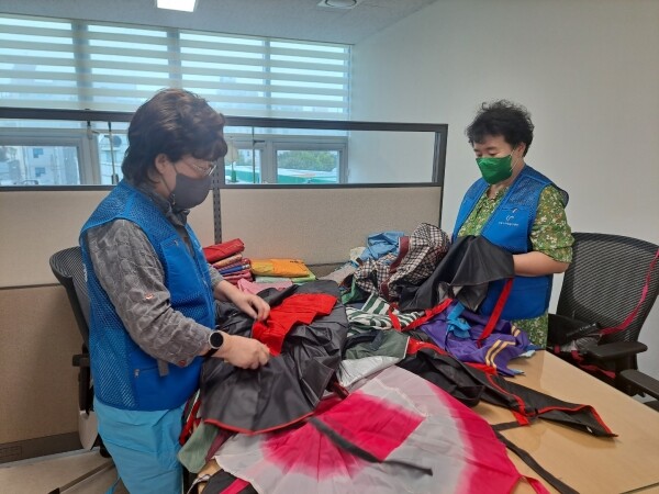 이번 활동은 지역사회보장협의체 지역복지 분과에서 진행되는 자원순환 캠페인의 하나로 자원봉사센터와 관내 복지관을 통해 사용하지 못하는 폐우산 천을 수거해 남동구 옷수선 봉사단의 재능기부로 재활용했다.