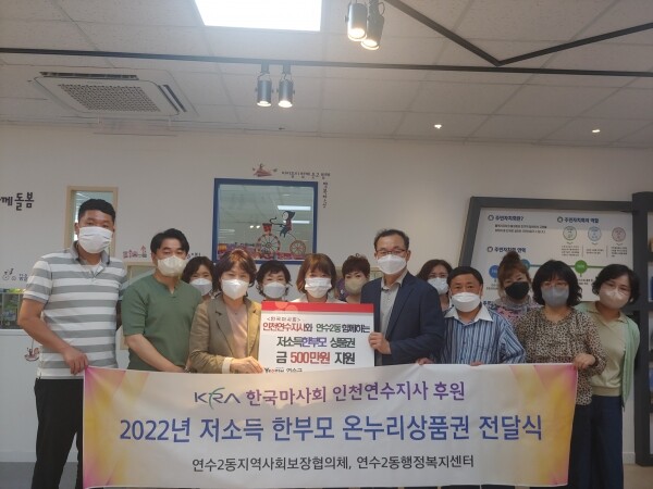 이번 사업은 경제적 어려움을 겪고 있는 저소득 한부모 세대에 온누리 상품권을 지원함으로써 2학기 필요물품 등을 구입해 원활한 학교생활을 지원하고 지역경제를 살리기 위한 것으로 한국마사회 인천연수지사에서 연수2동 지역사회보장협의체에 5백만원을 지정 기탁해 이뤄졌다.