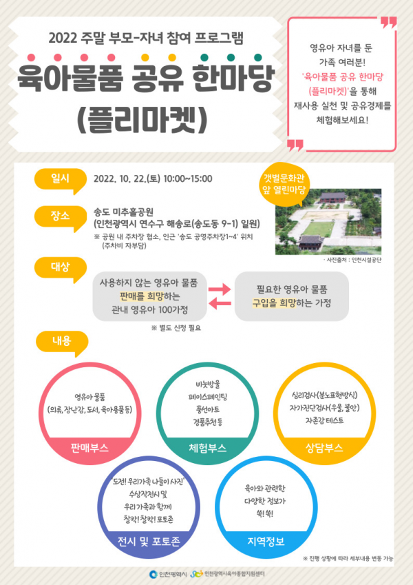인천시와 인천시 육아종합지원센터 주관으로 개최하는 이번 행사는 다음달 22일 오전 10시부터 오후 3시까지 송도 미추홀공원에서 진행된다.