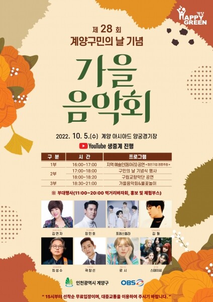 한편 계양구에서는 구민의 날을 맞아 ‘계양문화로 빛축제'를 오는 10월 4일부터 22일까지 19일간 계양문화로 구청 남측광장 등에서 개최한다.