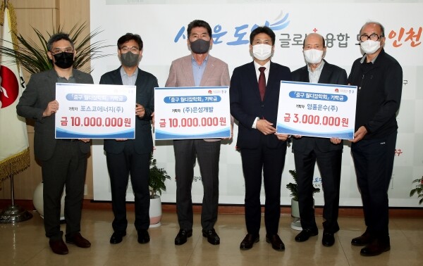 인천 중구 월디장학회는 지난 5일 ㈜은성개발 서영호 대표 1,000만원, 포스코에너지㈜ 정기섭 대표 1,000만원, 영풍운수㈜ 김수성 대표 300만원의 장학금을 기탁했다고 밝혔다.