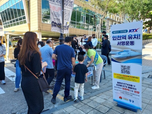 인천 중구는 월판선·인천발 KTX 인천역 유치를 위한 범구민 서명운동을 9월 15일부터 시작해 20여 일이 지난 10월 5일 현재 서명 인원은 총 1만 134명으로 홈페이지 4,530명, 서명부에 5,604명이 서명했다.