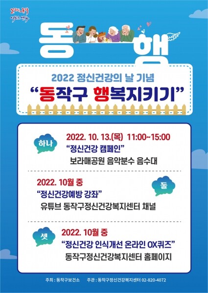 이번 캠페인은 10월 13일 오전 11시부터 오후 3시까지 신대방동 보라매공원 내 음악분수 주변에서 실시되며 정신건강에 대한 사회적 관심 제고 및 인식개선을 통해 구민의 마음 건강증진을 도모하고자 마련됐다.
