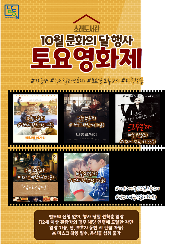 토요영화제는 10월 매주 토요일 오후 2시부터 상영하며 장소는 소래도서관 지하 1층 다목적실이다.