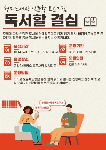 도서관 관계자는 “독서하기 참 좋은 계절인 가을, 혼자 하는 독서가 지루했던 분들에게 함께 읽는 즐거움을 경험할 수 있는 좋은 기회가 되기를 바란다”고 전했다.