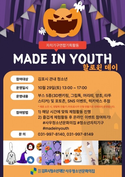 사우청소년문화의집 소속 자치기구 연합에서 기획, 운영하는 ‘Made in youth’ 프로그램은 3D펜 키링 만들기 그립톡 만들기 펠트 머리띠 만들기 양초 만들기 타투스티커 체험 등 할로윈을 연상하게 하는 여러 가지 체험거리로 채워진다.