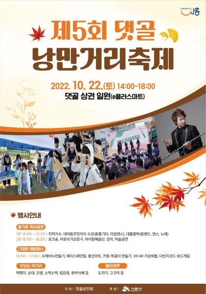 올해로 5회 째를 맞이한 댓골 낭만거리축제는 코로나19로 인해 3년 만에 다시 개최되는 뜻깊은 행사로 흥겨운 무대 공연과 풍성한 먹거리, 다양한 체험거리 등이 시민들을 반긴다.