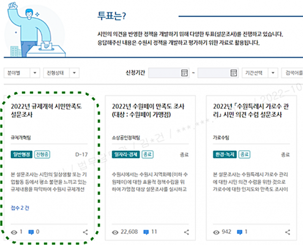 수원시 홈페이지 ‘시민참여→수원만민광장→투표’ 게시판에서 ‘2022년 규제개혁 시민 만족도 설문조사’를 선택해 참여할 수 있다.