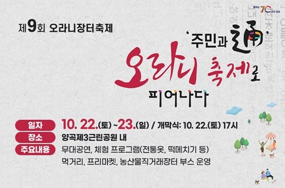 양곡 제3 근린공원 일원에서 열리는 ‘제9회 오라니장터 축제’는 ‘주민과 通 오라니축제로 피어나다’를 주제로 옛 오라니장터 모습을 재현하고 양촌주민과 김포시민 모두가 축제를 통해 화합과 소통하는 공간을 마련하기 위해 3년 만에 대면축제로 진행된다.