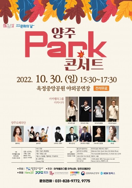 동요와 OST 등으로 이루어져 남녀노소 누구나 즐길 수 있는 ‘양주파크콘서트’는 전 프로그램이 무료이며 프로그램 운영시간은 10월 30일 오후 오후 3시30분부터 오후 5시30분 까지 이다.