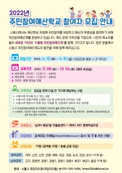 교육 대상은 시흥시에 주소를 두고 있는 사람, 시흥시의 관할구역에 소재한 기관 등에 근무하는 사람, 시흥시에서 사업체를 둔 사람이 해당되며 특히 주민참여예산이나 주민자치 관련 활동 경력자들의 적극적인 참여를 기다린다.