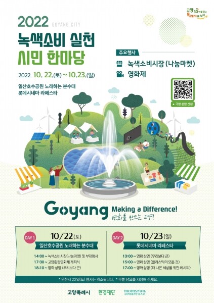 고양특례시와 환경재단, 사회적협동조합 맘스런이 주최하는 이번 행사는 시민 참여마당 ‘고양시에 바란다’, 녹색소비시장 나눔마켓, 환경영화제 등으로 풍성하게 열릴 예정이다.