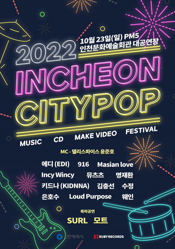 [2022 인천시티팝] 초대 가수로는 최근 밴드 서바이벌 프로그램 ‘그레이트서울인베이젼’에서 뛰어난 실력으로 주목받은 밴드 ‘SURL’과 MBC ‘복면가왕’에서 개성있는 목소리로 주목 받은 인디 아이돌 ‘모트’가 본선 축하무대를 갖는다.