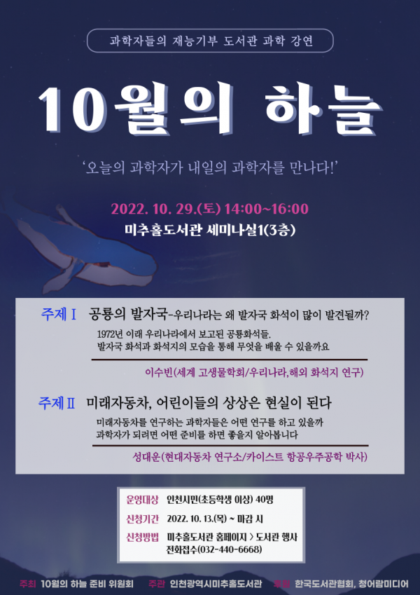 미추홀도서관에서 10월의 하늘 준비 위원회 및 한국도서관협회와 협력해 운영하는 ‘10월의 하늘’행사는 전국 50개 도서관에서 동시에 열리며 과학자들의 재능기부로 이루어지는 과학 강연이다.
