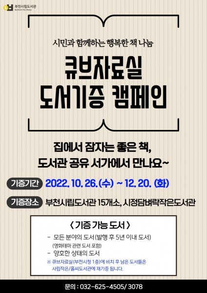 조용익 부천시장은 “시민들이 갖고 계신 한 권 한 권의 좋은 책들이 큐브자료실 공유 서가로 모이고 다시 시민들에게 선순환되는 나눔과 공유문화가 확산되고 책 읽기 좋은 가을이 더욱 풍성해지고 책 읽는 문화가 활성화되기를 기대한다”고 말했다.