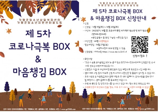 이번 ‘5차 코로나 극복 & 마음챙김 BOX’는 9, 10월에 코로나 확진 판정을 받은 청소년이 대상이며 신청접수는 가평군청소년상담복지센터 홈페이지 공지사항을 참고해 온라인 신청서를 작성 후 제출하면 된다.