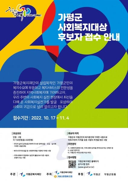 후보자는 가평군민의 삶의 질 향상을 위해 우수한 정책 발굴·도입·실시에 기여한 사람과 복지사각지대 발굴 및 사회취약계층 지원에 기여한 사람 그리고 지역사회복지 현장에서 실천적 활동으로 다른 사람의 모범이 되는 사람을 대상으로 하고 있다.