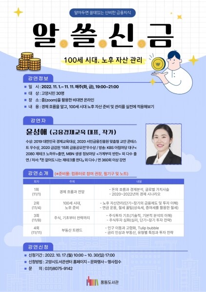 프로그램은 경제의 흐름을 이해하고 100세 시대 노후 자산 준비 및 관리를 실전으로 적용해보는 시간이 될 예정이다.