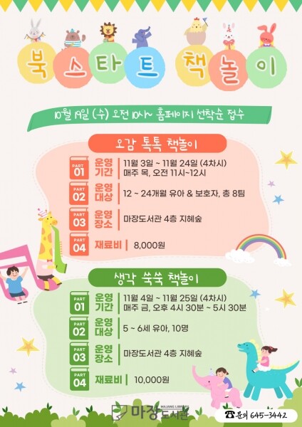 이번 프로그램은 12~24개월 유아와 보호자를 대상으로 하는 ‘오감 톡톡 책놀이’, 5~6세 아동을 대상으로 ‘생각 쑥쑥 책놀이’ 2개 과정으로 진행한다.