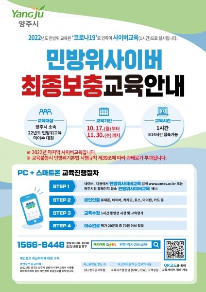 교육대상자는 양주시청 홈페이지 배너 또는 '민방위 사이버교육' 홈페이지를 통해 교육을 수강할 수 있다.