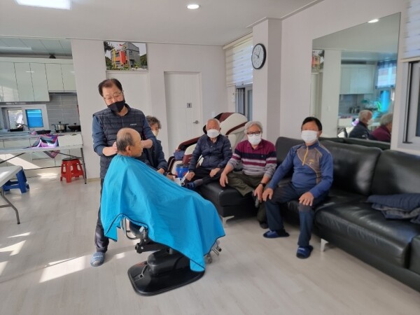 보산동 잔디이발관 김노경 대표는 매달 걸산동을 방문해 이발봉사를 하고 있으며 40년 이상 지속적으로 재능기부를 이어가고 있다.