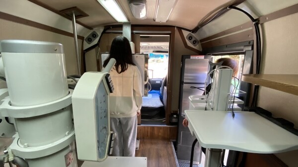 추가 검진 대상자는 학교로 방문한 검진 차량에서 이동형 방사선 촬영기로 경추부터 골반까지 촬영한다.