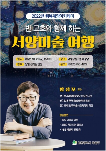 이번 행사를 기획한 구 관계자는 “행복계양 아카데미는 코로나19 이후 3년 만의 대면 강연으로 많은 구민이 관심과 흥미를 가질 수 있는 주제의 특강을 준비하는데 힘을 쏟았다”며 “미술을 통해 인문학을 이해하는 데 도움이 되는 시간이 되길 바란다”고 말했다.